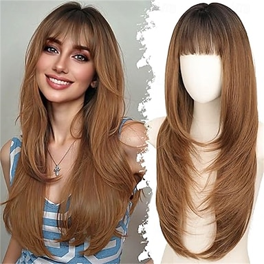Parrucca lunga, liscia e scalata, biondo ramato con frangia, 24 pollici, in capelli sintetici naturali, morbida e resistente al calore, per uso quotidiano e feste.