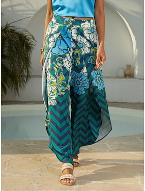 pantaloni a gamba larga in raso con orlo curvo e incrocio, perfetti per una fuga estiva