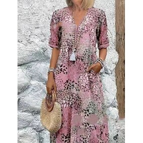 Per donna Abito Etnico Abito Largo Abito lungo maxi Rosa Manica 3/4 Stampa Floreale marocchino Oversize Stampa Primavera & Autunno Interstagionale colletto dentellato Casual Traspirante Larghi XS S M