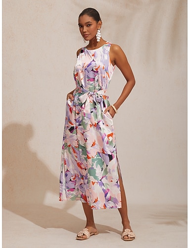 abito lungo estivo rosa con drappeggi e fiori primaverili