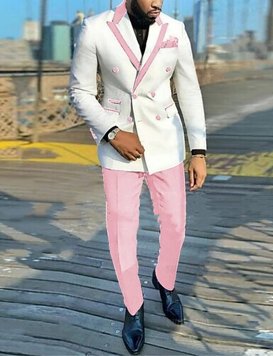 Uomo Completi Matrimonio Bianco Rosa Primavera, Autunno, Inverno, Estate Tuta Collare di chiusura A quadri Vestibilità standard 2 pezzi Doppiopetto a sei bottoni