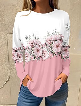 Maglietta da donna a maniche lunghe base floreale stampa a maniche lunghe Top regolari con scollo rotondo weekend festivo bianco rosa rosso blu navy blu autunno e inverno prefestivo