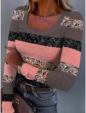 Per donna Maglietta Stampato Grafico Geometrico A righe Vintage Moda Elegante Manica Lunga Girocollo Top Regolari Quotidiano Blu Nero Rosa Marrone chiaro Caffè Estate Primavera Autunno