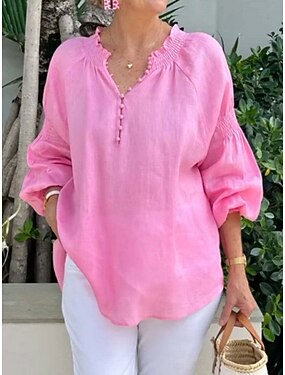 Per donna Blusa Finto cotone e lino Tinta unica Elegante Casual Manica 3/4 Scollo a V Top Regolari Quotidiano Nero Bianco Rosa Verde Albicocca Estate Primavera