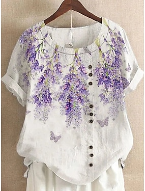 Per donna Camicia Blusa Finto cotone e lino Stampato Floreale Grafico Casual Manica Corta Girocollo Top lunghi Quotidiano Blu Viola chiaro Arancione Verde Estate Primavera