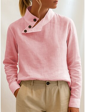 Per donna Blusa Camicia di cotone Bottoni Tinta unica Quotidiano Elegante Essenziale Manica Lunga Collo Alto Top Regolari Quotidiano Blu Bianco Rosa Verde Primavera Autunno