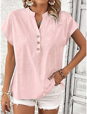 Per donna Finto cotone e lino Ricamato Bottoni Tinta unica Essenziale Casual Manica 3/4 Girocollo Top Regolari Quotidiano Blu Rosa Albicocca Estate