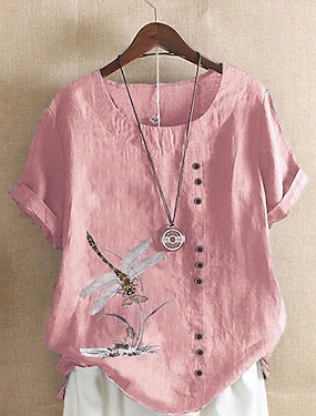 Maglietta da donna 100% cotone Blusa Stampa con Bottoni Weekend Streetwear Base Casual Simile al Lino Maniche Corte Collo A Giro Bianco Estate Primavera