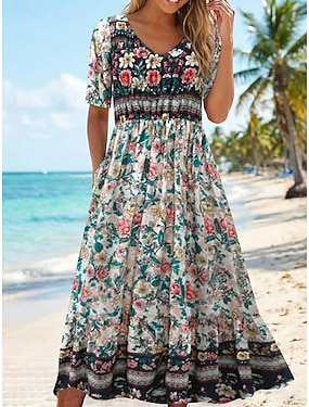 Per donna Abito lungo maxi Abito Lungo Maxi Abito Abito da Spiaggia Abito Floreale Abito Boho Elegante Moda Moderno Quotidiano All'aperto Vacanza Vestibilità regolare Floreale Manica Corta Scollo a V