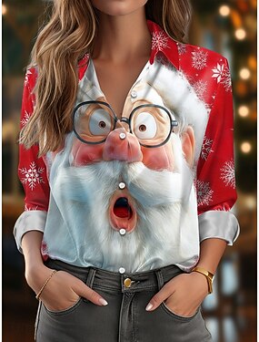 Natale Per donna Camicia Grafico Babbo Natale Vintage Elegante Casual Manica Lunga Colletto a Camicia Top Regolari Lavoro Quotidiano Ferie Bianco Rosso Verde Autunno Inverno