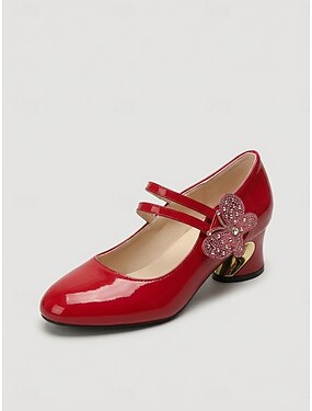 Scarpe Mary Jane da donna in similpelle verniciata rosso acceso - eleganti décolleté a blocco con punta arrotondata e farfalla, perfette per l'uso quotidiano, stile moderno vintage. &stile elegante da