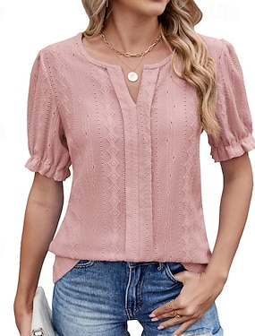 Per donna Blusa con texture Top traforato Maglietta traforata Maglietta Traforato Tinta unica Moda Classico Casual Manica Corta Scollo a V Top Regolari Casuale Quotidiano Spiaggia Nero Bianco Rosa