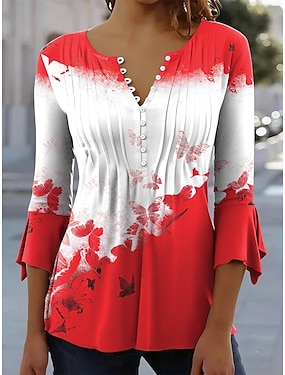 T-Shirt da Donna Ombre Grafica Farfalla Elegante Maniche 3/4 Collo Girocollo Top Lunghi da Indossare Ogni Giorno Ruches Bottoni Nero Rosso Viola Marrone Primavera Autunno
