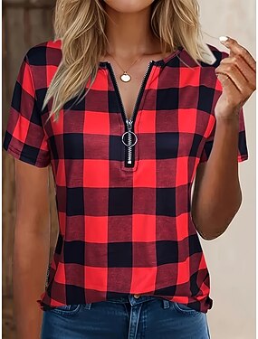 Per donna Maglietta Zip a un quarto Grafico Plaid Tropicale Hawaiano Elegante Manica Corta Girocollo Top Regolari Quotidiano Sportivo Uscire Blu Rosso Viola Verde Estate Primavera