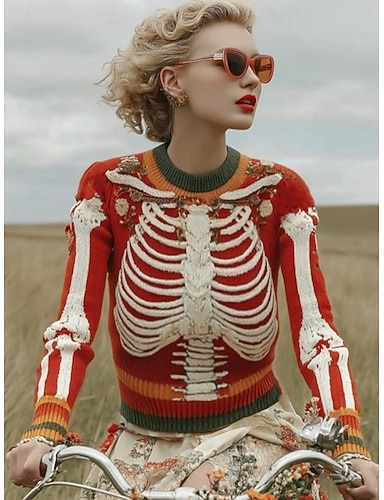 Maglione da donna Carino Streetwear Casual Grafica Scheletro Collo Giro Patchwork Lavorato a Maglia Manica Lunga Top Regolari Maglia Nera Rossa Autunno Inverno