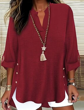 Per donna Camicia Blusa Finto cotone e lino Bottoni Semplice Elegante Manica 3/4 Scollo a V Top Regolari Quotidiano Ferie Uscire Nero Verde militare Rosso Blu marino Grigio chiaro Estate Primavera