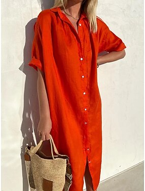 Per donna Abito Midi Finto cotone e lino Abito Camicia Vestito a caftano Moda Moderno Quotidiano All'aperto Vacanza Vestibilità regolare Semplice Manica Corta Colletto a Camicia Blu Bianco Rosa Rosso