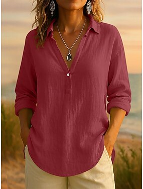 Per donna Camicie di cotone e lino Finto cotone e lino Tinta unica Essenziale Casual Manica 3/4 Scollo a V Top Regolari Quotidiano Blu Rosso Verde Cachi Estate Primavera