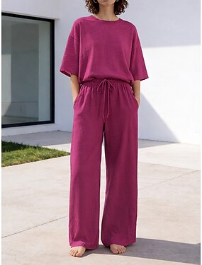 Completo pantaloni da donna in lino al 15%, completo in lino, tinta unita, tasca, elastico in vita, t-shirt, pantalone, casual, a maniche lunghe, girocollo, blu, nero, bianco, blu navy, marrone chiaro, estate, primavera