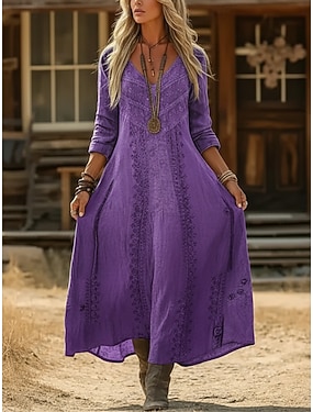 Per donna Abito maxi Abito Boho Abito Vintage Vestito Casual Vintage Quotidiano All'aperto Vacanza Vestibilità comoda Geometrico Manica Lunga Scollo a V Blu Viola Fucsia Verde Primavera Autunno