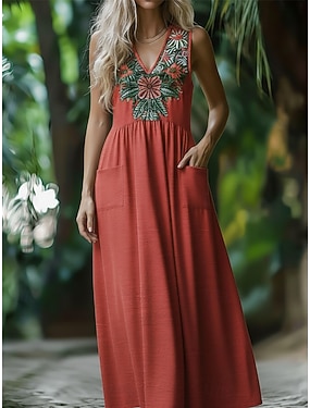 Per donna Abito maxi Abito Boho Abito Floreale Vintage Moda Moderno All'aperto Vacanza Uscire Vestibilità regolare Floreale Senza Maniche Scollo a V Rosso Estate Primavera