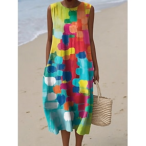 Abito Midi da Donna in Lino Similare Vestito Estivo Vacanza Casual Spiaggia Uscita Vestibilità Larga Grafica Geometrica Senza Maniche Collo Tondo Blu Rosso Viola Verde Estate Primavera