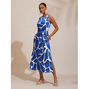 Per donna Femminile Abito Lungo Maxi Abito Blu Manica Corta Geometrico Estate Scollo a V Vacanza XS S M