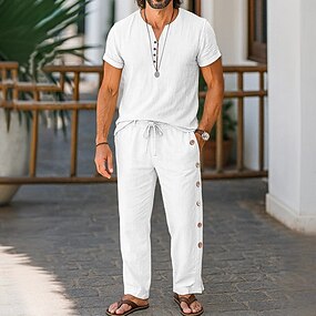 Per uomo Camicia Camicia di lino Camicia Estiva Abbigliamento da spiaggia Maglia Henley Tinta unica Casuale Vacanza Blu Nero Bianco Blu marino Manica Corta Scollo a V Estate Primavera Abbigliamento