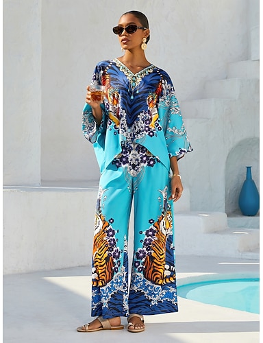 Per donna Femminile Camicia casual Geometrico Casuale Manica a Vescovo Blu Nodo frontale Manica 3/4 Elegante Vacanza Scollo a V Estate Autunno Interstagionale