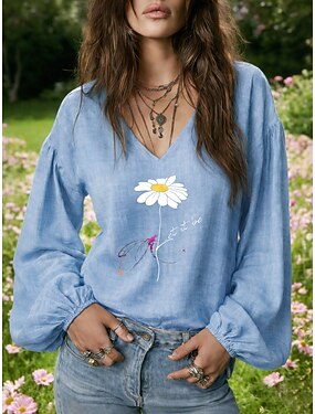 Camicia in Lino Sintetico Simile al Cotone per Donna Stampa Grafica Margherita Elegante Bohemia Vintage Manica Lunga Collo a V Top Quotidiani Vacanza Blu Giallo Rosa Viola Verde Estate Primavera