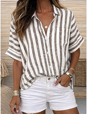 Per donna Blusa Camicia in finto lino Bottoni Stampato A righe Elegante Casual Mezza Manica Colletto a Camicia Top Regolari Quotidiano Blu Nero Giallo Rosa Verde Estate Primavera Autunno