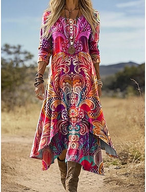 Abito Midi da Donna Boho Vestito Shift Vacanza Casual Quotidiano Vacanza Vestibilità Larga Grafica Geometrica Paisley Manica Lunga Collo Giro Giallo Chiaro Verde Chiaro Fucsia Marrone Estate