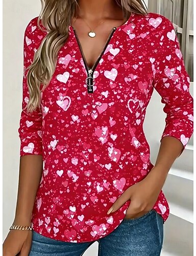 San Valentino Per donna Maglietta Cerniera Stampato Cuore Grafico Bohemien Tropicale Hawaiano Manica Lunga Scollo a V Top Regolari Quotidiano Uscire Weekend Blu Rosso Estate Primavera Autunno Inverno
