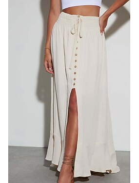 gonne lunghe da donna in finto cotone e lino, vita media, orlo asimmetrico semplice, spacchi, micro-elastico, vacanza, strada, bianco e nero, estate, cotone