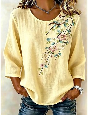Per donna Camicia Floreale Grafico Vintage Elegante Manica Lunga Girocollo Top Regolari Casuale Blu Bianco Giallo Rosa Verde Estate Primavera