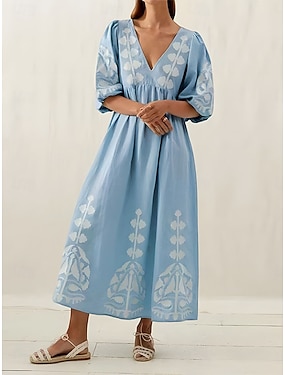 abito lungo da donna in finto cotone e lino, abito a trapezio, abito bianco, abito casual, basic casual, quotidiano, all'aperto, per le vacanze, vestibilità regolare, geometrico, mezza manica, scollo a V, blu, bianco, giallo, rosa