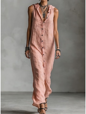 abito lungo da donna in finto cotone e lino, abito estivo casual, vestibilità ampia, tinta unita, senza maniche, con cappuccio, blu navy, nero, rosa, marrone, estate