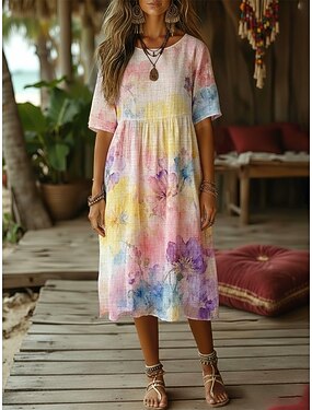 Per donna Abito Midi Finto cotone e lino Abito Boho Abito a Tubino Vestito Casual Elegante Quotidiano All'aperto Spiaggia Vestibilità comoda Floreale Mezza Manica Girocollo Rosa Estate Primavera