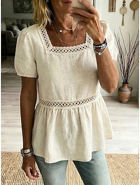 Per donna Camicie di cotone e lino Blusa Finto cotone e lino Traforato Tinta unica Vintage Elegante Casual Manica Corta Collo quadrato Top Regolari Quotidiano Nero Bianco Giallo Rosa Estate Primavera