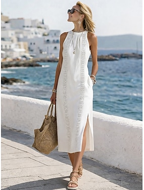 Per donna Abito Midi Misto cotone Abito a Tubino Vestito Estivo Moda Essenziale Classico Quotidiano All'aperto Ferie Vestibilità regolare Semplice Senza Maniche Girocollo Bianco Arancione Cachi