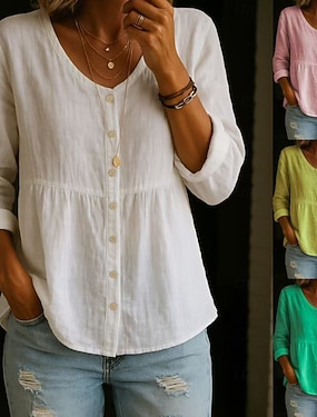 Blusa in cotone e lino per donne bottoni colore solido stilosa casual maniche lunghe scollo a V top regolari quotidiano bianco giallo rosa verde estate primavera autunno