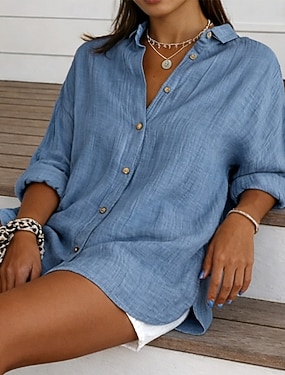 Per donna Camicia Abbottonare Blusa Finto cotone e lino Bottoni Tinta unica Essenziale Casual Manica Lunga Colletto Polo Top lunghi Quotidiano Blu Nero Bianco Grigio Estate