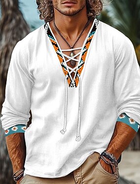 Per uomo Stile vichingo Camicia estiva Abbigliamento mare Maglietta informale Liscio Da mare Curise Marrone Cachi Beige Manica lunga A V Primavera estate Abbigliamento