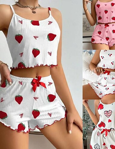 pigiama da donna per San Valentino, pigiama da notte, set da 2 pezzi, frutta, labbra, caldo, morbido, dolce, San Valentino, palestra, girocollo, top corto, pantaloncini, estate, primavera, abiti per