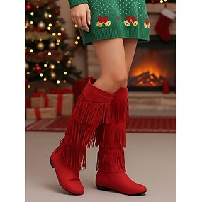 stivali alti fino al ginocchio con frange rosse da donna – stile western festivo, vestibilità morbida e confortevole, perfetti per feste di Natale, gite invernali e costumi stagionali