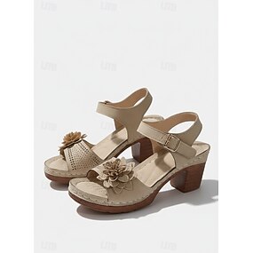 Sandali con tacco grosso da donna a fiori – scarpe estive in similpelle marrone con cinturino alla caviglia e motivo floreale 3D per passeggiate in giardino e riunioni all'aperto