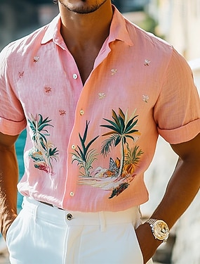 Per uomo Camicia di lino Camicia Estiva Abbigliamento da spiaggia Camicia con Bottoni Palma Vacanza Ferie Rosa Manica Corta Collo ripiegato Estate Primavera Abbigliamento
