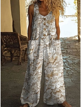 tuta intera da donna in finto cotone e lino, modello sportivo, floreale, senza maniche, gamba larga, scollo a U, tasche, bottoni, per tutti i giorni, vacanze, vestibilità ampia, blu, marrone, verde,