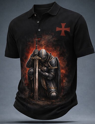 Per uomo Cavalieri Templari Polo Manica Corta Magliette polo Bavero Vintage Casual Streetwear Athleisure Abbigliamento quotidiano Stampa 3D Bottoni Tessuto retato traspirante Estate Primavera Nero