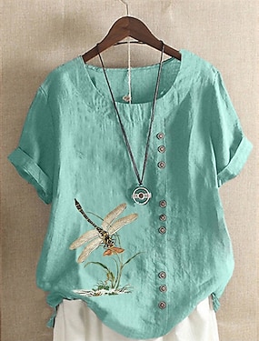 Per donna Camicie di cotone e lino Animale Gatto Elegante Vintage Tropicale Senza Maniche Manica Corta Girocollo Top Regolari Quotidiano Ferie Abbigliamento da vacanza Bottoni Verde primavera Bianco